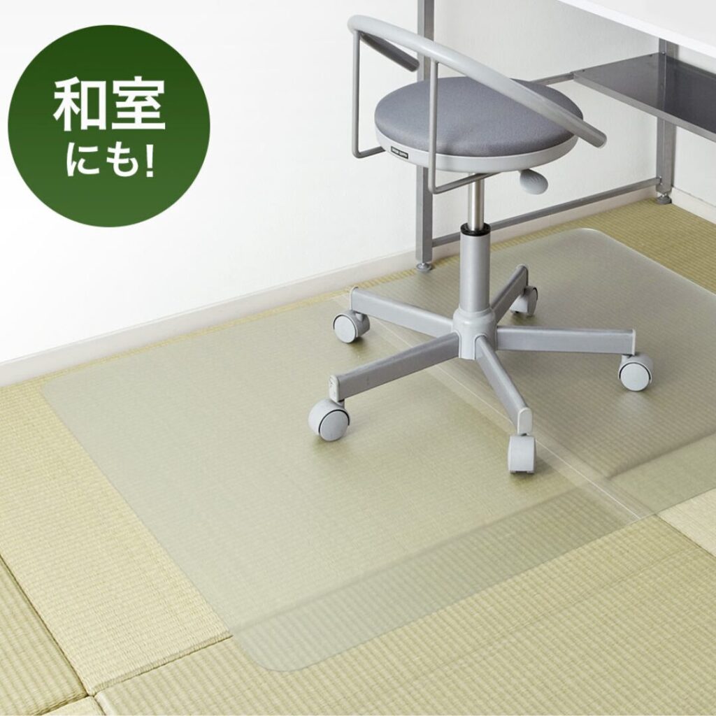 透明の高いマットで畳の外観を壊すことなく、強度も強いため凹み、傷から守る事ができます。また変色しにくく、キャスター付きでも快適なほどの硬度です。